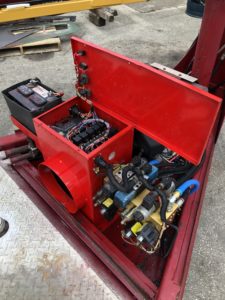 Compromised hydraulic components are replaced as well as all hosing. Failed or compromised electric components are replaced including all wiring when necessary. Certain electrical upgrades related to safe operation are included. Safety system operation is restored. The engine is generally replaced with new.